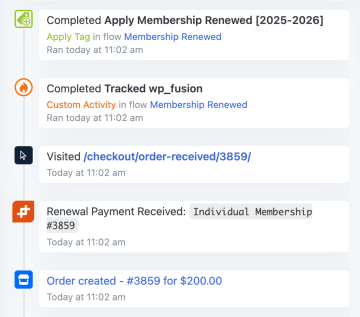 4. Check the Activity Feed: In the contact’s timeline, you should see a new log entry for the custom activity: `connector_event renewal_payment_received`.