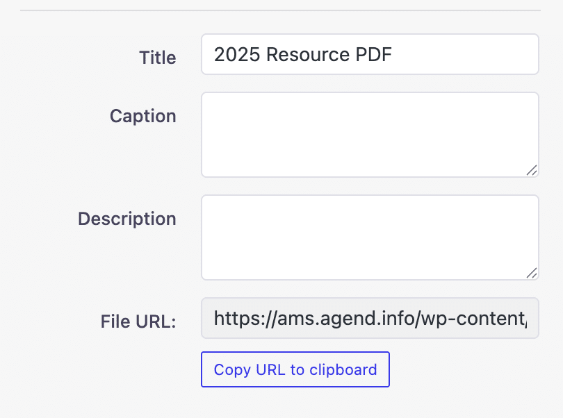 Once uploaded, open the file in the Media Library and copy its URL using the “Copy to clipboard” option.